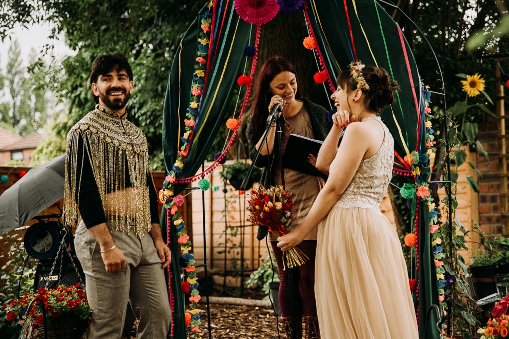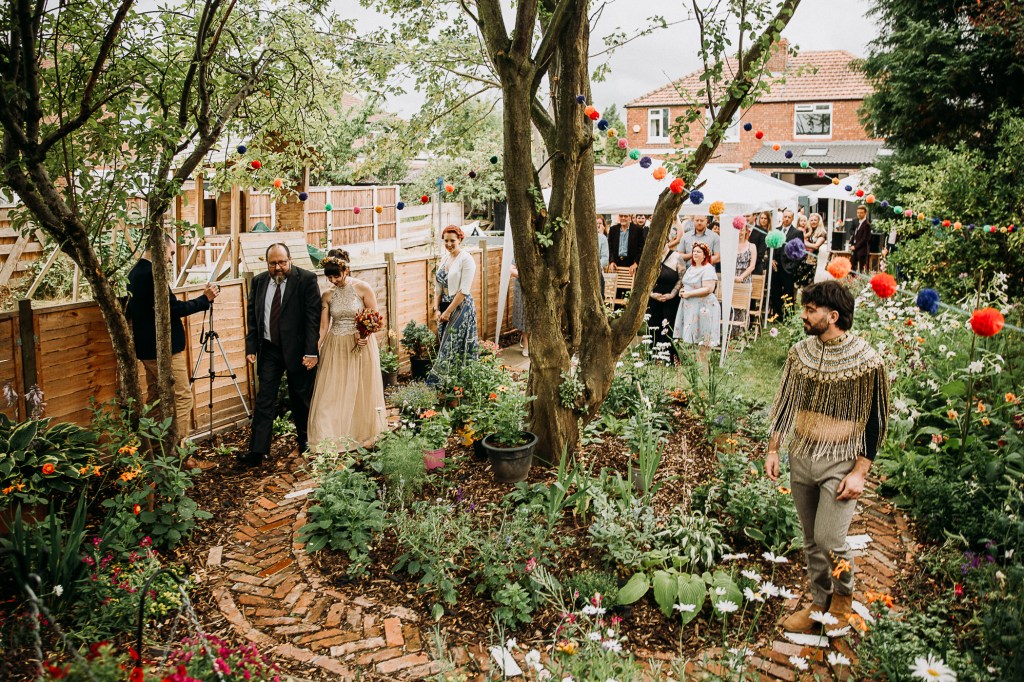 As you can see, the space behind their semi-detached home in Withington wasn’t huge, but it was just big enough to squeeze all of Kirsty and Jack’s nearest and dearest inside. What made it even more special was that for the two years beforehand they’d spent all their free time completely re-landscaping, putting down the gorgeous mosaic path you can see bordering the tree one piece at a time and creating a raised rockery area where the ceremony arch was placed.